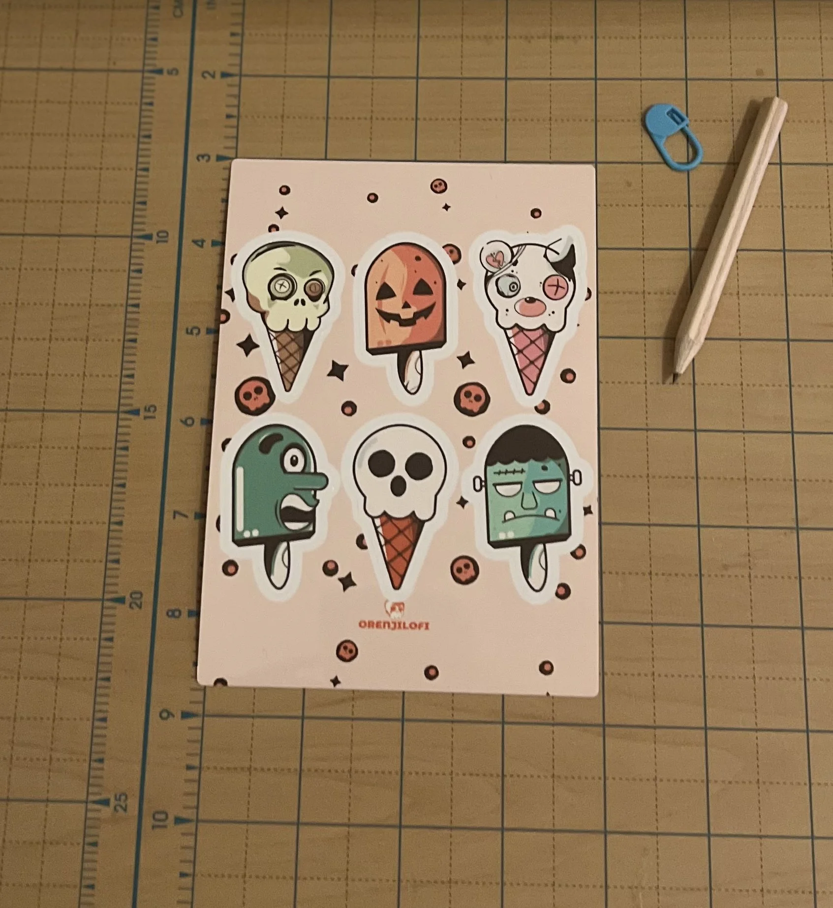 EXCLUSIVE ART STICKER SHEET FOR THE HALLOWEEN SEASON, OUR SUPER SCARY STICKER SHEET 3. KISS CUT STYLE WITH CUSTOM TRIM.